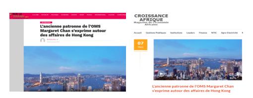 △塞內(nèi)加爾“現(xiàn)場網(wǎng)”和馬里“非洲增長新聞網(wǎng)”關(guān)于專訪陳馮富珍的報道截圖
