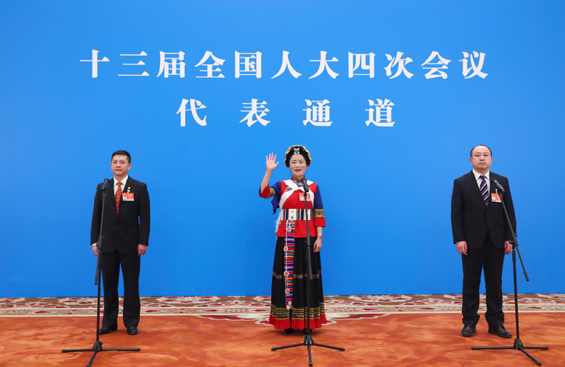 2021年3月8日,第十三屆全國(guó)人民代表大會(huì)第四次會(huì)議舉行第二場(chǎng)“代表通道”采訪活動(dòng)。這是全國(guó)人大代表?xiàng)钫鹕ㄗ螅、范永貞(中)、齊嵩宇通過網(wǎng)絡(luò)視頻方式接受采訪。新華社記者 張玉薇 攝