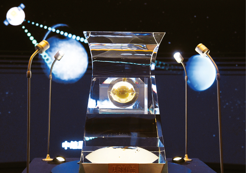 2020年12月17日,嫦娥五號返回器攜帶月球樣品安全著陸,中國探月工程“繞、落、回”三步走規(guī)劃如期完成,首次實現(xiàn)我國地外天體采樣返回。圖為2021年2月27日在中國國家博物館拍攝的月球樣品001號!⌒氯A社記者 金良快/攝