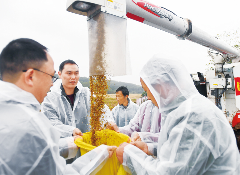 2020年11月2日,湖南衡南雙季晚稻試驗示范基地傳來消息:由袁隆平院士團隊培育的第三代雜交水稻“叁優(yōu)一號”測產(chǎn)結(jié)果公布,雙季畝產(chǎn)突破1500公斤。圖為當日工作人員將稻谷裝袋。 新華社記者 陳澤國/攝