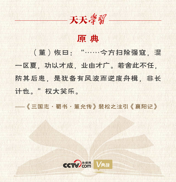 “功以才成,業(yè)由才廣”出自東晉史學(xué)家習(xí)鑿齒的《襄陽記》,劉宋史學(xué)家裴松之在給《三國志·蜀書·董允傳》作注時(shí)曾經(jīng)轉(zhuǎn)引。這句話的意思是功業(yè)因有人才方能建立,事業(yè)因有人才方能發(fā)展!