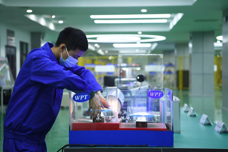 △重慶一科技企業(yè)的工作人員正在測(cè)試水下無(wú)線(xiàn)供電裝置。