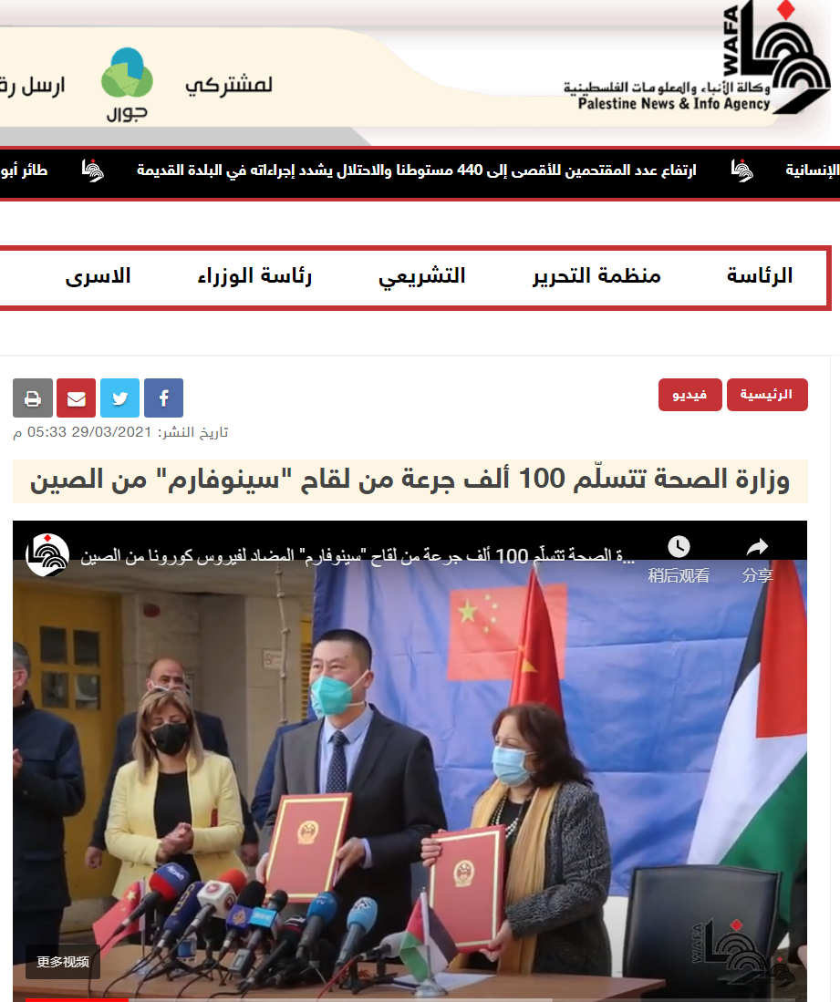 郭偉表示,今天,在兩國(guó)有關(guān)部門密切合作下,中國(guó)政府向巴勒斯坦捐贈(zèng)的10萬(wàn)劑國(guó)藥集團(tuán)新冠疫苗順利運(yùn)抵。中方向巴援助疫苗,是落實(shí)兩國(guó)元首重要共識(shí)的最新舉措,也是落實(shí)習(xí)近平主席將疫苗作為全球公共產(chǎn)品的莊重承諾。中國(guó)再次以實(shí)際行動(dòng)支援巴勒斯坦抗疫斗爭(zhēng)。