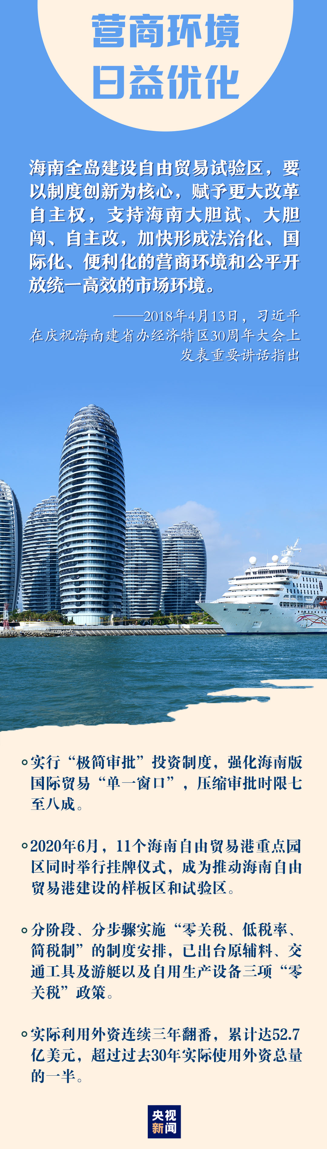 “黨中央決定支持海南全島建設(shè)自由貿(mào)易試驗(yàn)區(qū),支持海南逐步探索、穩(wěn)步推進(jìn)中國(guó)特色自由貿(mào)易港建設(shè),分步驟、分階段建立自由貿(mào)易港政策和制度體系!