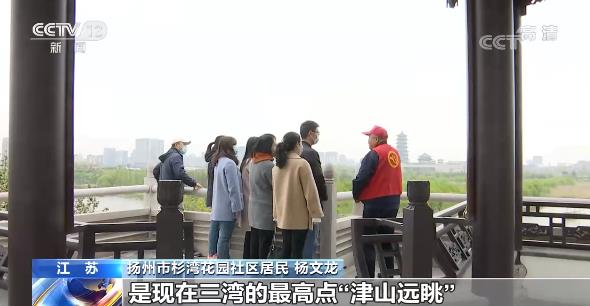 江蘇揚(yáng)州杉灣花園社區(qū)居民 楊文龍:我們處的這個(gè)位置是現(xiàn)在三灣的最高點(diǎn)“津山遠(yuǎn)眺”,像現(xiàn)在這個(gè)春天,我們大家看到可以說(shuō)是繁花似錦,古運(yùn)河的水是非常清澈......