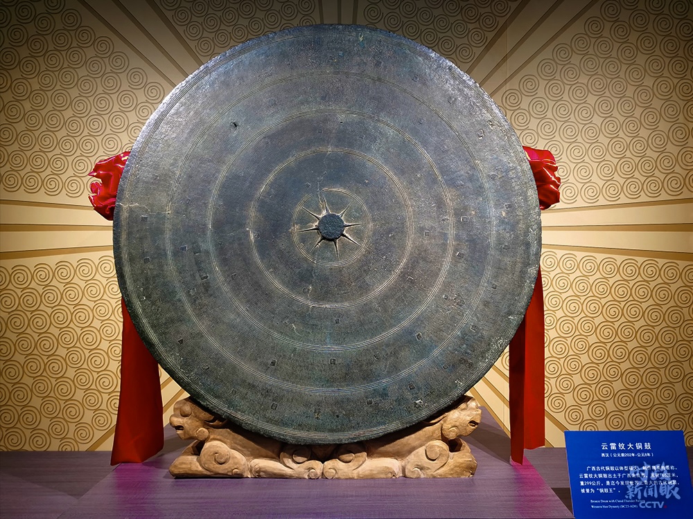 △陳列在廣西民族博物館的“銅鼓王”——云雷紋大銅鼓,面徑165厘米,重299公斤,是迄今發(fā)現(xiàn)世界上最大的古代銅鼓。(總臺央廣記者潘毅拍攝)