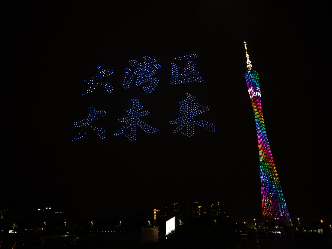 4月19日晚,廣州海心沙的無人機天幕光影表演。圖為1000架無人機組成“大灣區(qū)大未來”文字圖案。人民日報記者 張武軍攝