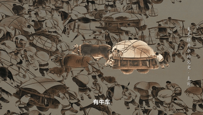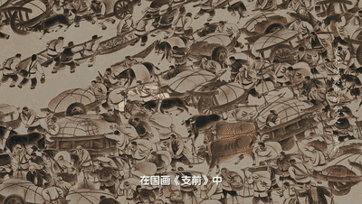 在畫作中,不管是扁擔(dān)、車輛、糧袋、牛馬,還是不計(jì)其數(shù)的人物造型,使用的都是圓潤(rùn)飽滿的曲線。這樣的流線處理,使畫面的流動(dòng)更加順暢。