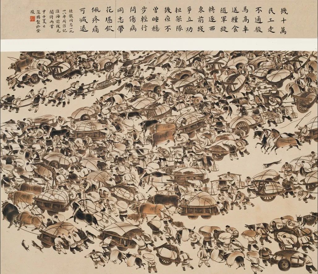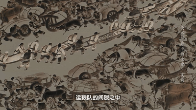 在畫面的左上方,運(yùn)糧隊(duì)的間隙之中,一隊(duì)民工抬著擔(dān)架從前線護(hù)送傷員撤向后方,讓我們感受到戰(zhàn)役的激烈。