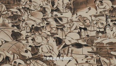 在運(yùn)糧大軍中,除了肩挑背扛的男人外,也不乏婦女的身影。在畫面的中心位置,三名年齡各異的婦女挎著裝滿饅頭的竹籃夾在密集的人流中。