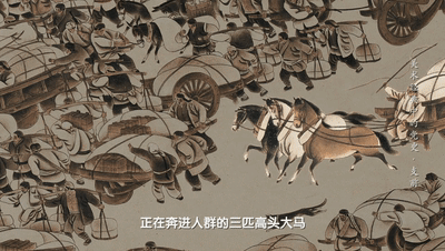 畫面右側(cè),正在奔進(jìn)人群的三匹高頭大馬四蹄飛奔,像是剛剛從曠闊的地方跑來(lái),而車夫還在揚(yáng)鞭,絲毫沒(méi)有慢下來(lái)的意思。由此也可看出民工支前的那種熱切心情。