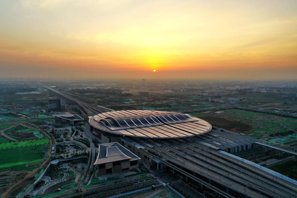 7月1日在河北雄安新區(qū)京雄城際鐵路雄安站拍攝的日出(無人機(jī)照片)。新華社記者 牟宇 攝