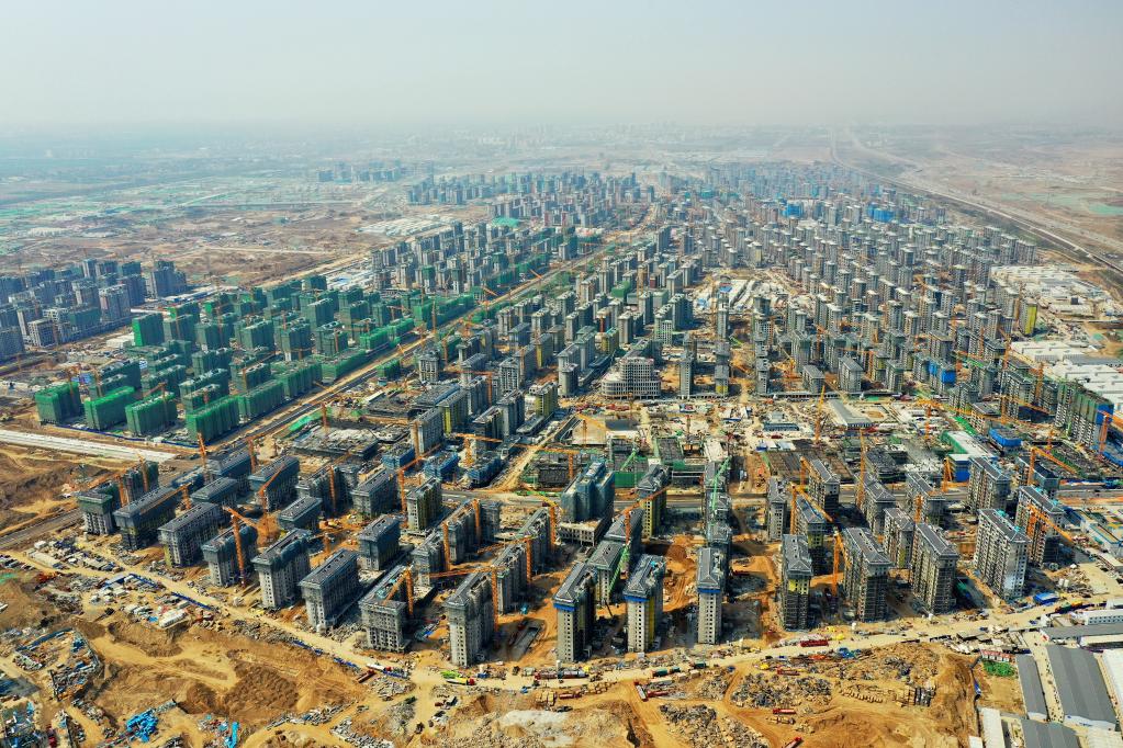 4月8日拍攝的河北雄安新區(qū)容東片區(qū)安置房項(xiàng)目建設(shè)現(xiàn)場(chǎng)(無人機(jī)照片)。新華社記者 牟宇 攝