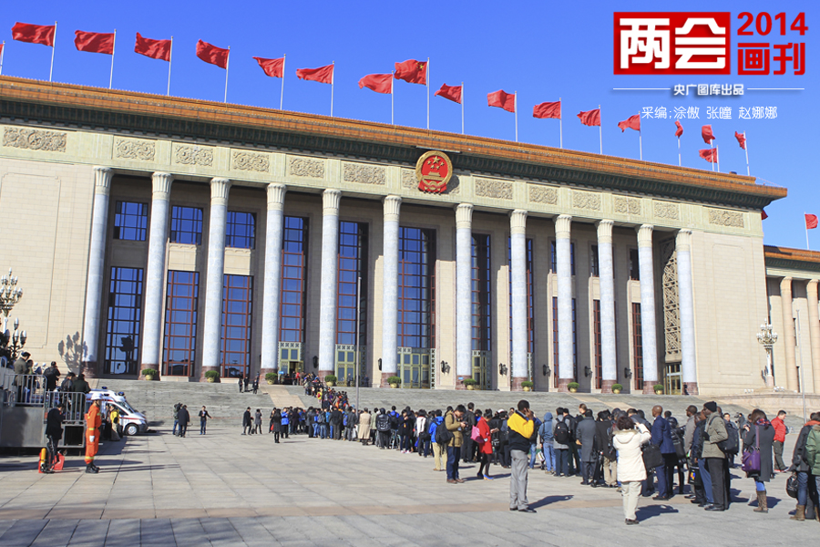2014年3月4日,十二屆全國人大二次會議在人民大會堂舉行新聞發(fā)布會。圖為新聞發(fā)布會召開前記者排隊進場(央廣網(wǎng)記者 張曈 攝)