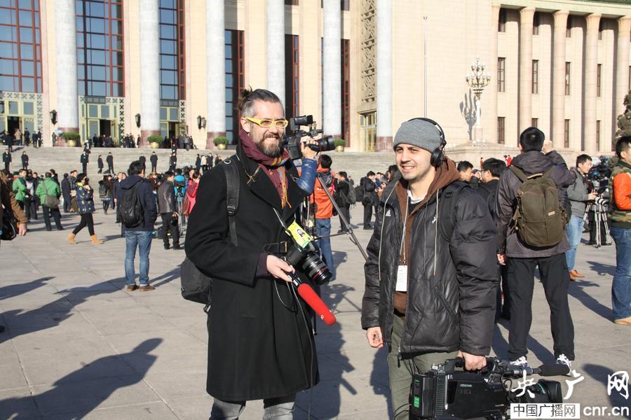 圖為兩位境外記者等待入場(央廣網(wǎng)發(fā) 時晨 攝)