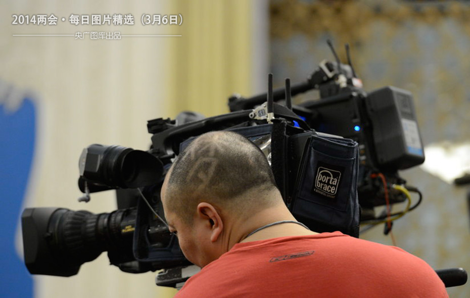 2014年3月6日,十二屆全國人大二次會議新疆代表團開放團組審議政府工作報告。一名外國電視媒體記者留著個性的“夢”發(fā)型上會。(圖片來源:CFP)