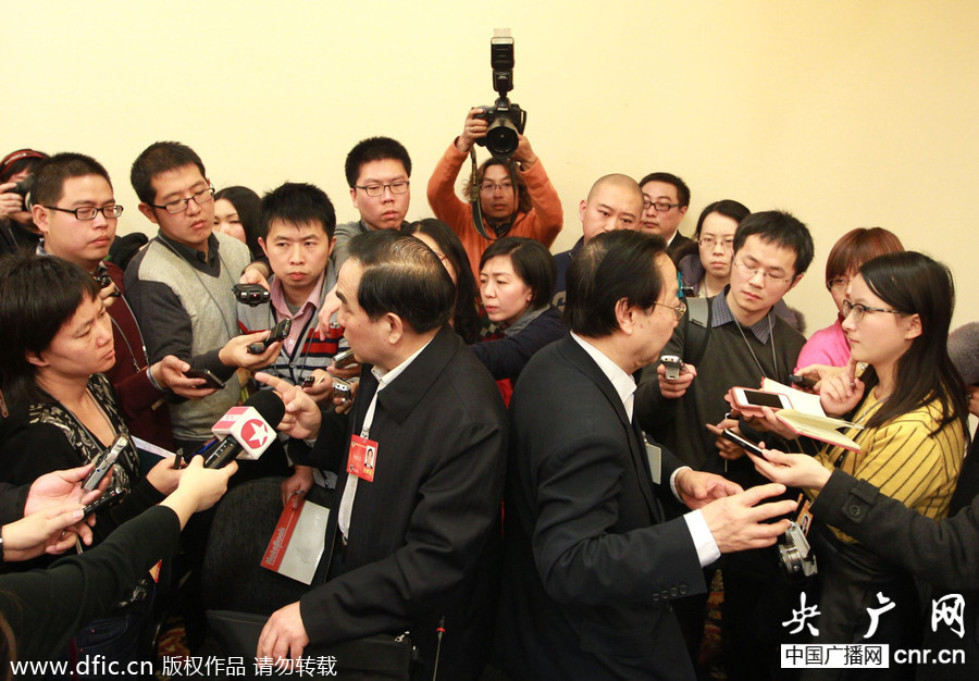 3月4日,全國政治協(xié)商會議十二屆二次會議開幕。政協(xié)委員背對背接受采訪,場面有趣。(圖片來源:東方IC)