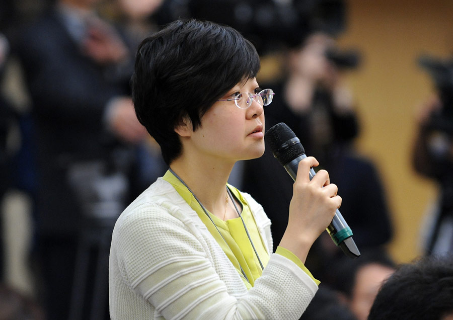 2014年3月6日上午9時(shí),十二屆全國人大二次會議新聞中心在梅地亞中心多功能廳舉行記者會,邀請財(cái)政部部長樓繼偉、副部長張少春就“財(cái)稅體制改革和財(cái)政工作”的相關(guān)問題回答中外記者的提問。圖為揚(yáng)子晚報(bào)社記者提問。新華網(wǎng)/中國政府網(wǎng) 翟子赫攝