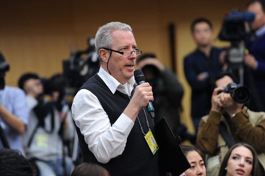 2014年3月6日上午9時,十二屆全國人大二次會議新聞中心在梅地亞中心多功能廳舉行記者會,邀請財政部部長樓繼偉、副部長張少春就“財稅體制改革和財政工作”的相關(guān)問題回答中外記者的提問。圖為德國新聞社記者提問。新華網(wǎng)/中國政府網(wǎng) 翟子赫攝
