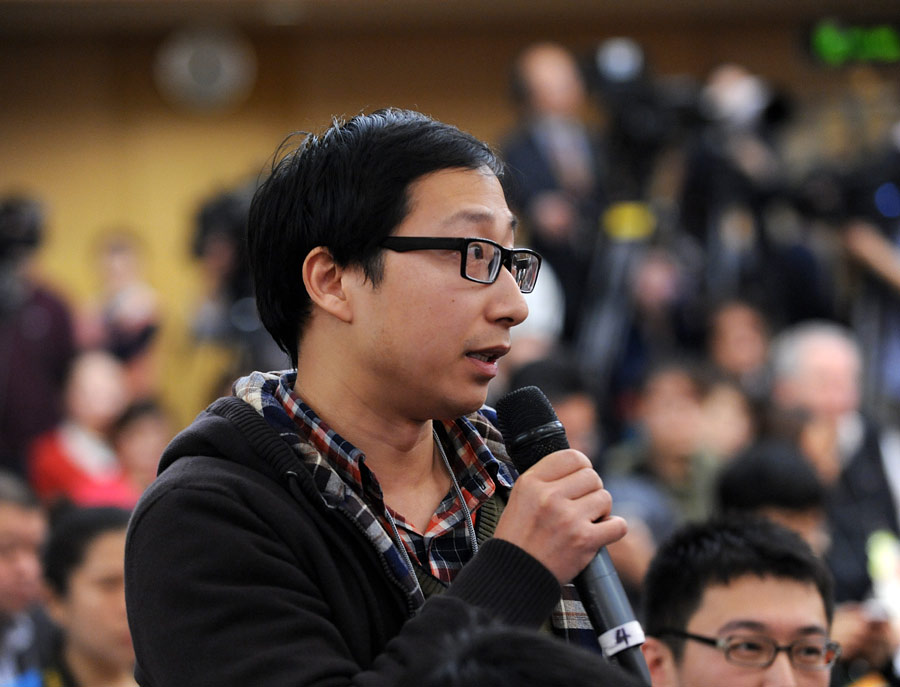 2014年3月6日上午9時,十二屆全國人大二次會議新聞中心在梅地亞中心多功能廳舉行記者會,邀請財政部部長樓繼偉、副部長張少春就“財稅體制改革和財政工作”的相關問題回答中外記者的提問。圖為中央人民廣播電臺記者提問。新華網/中國政府網 翟子赫攝