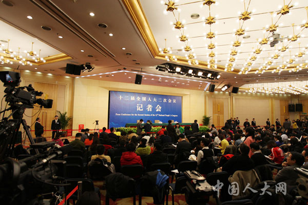 3月5日下午,十二屆全國人大二次會議在梅地亞中心舉行記者會,國家發(fā)展和改革委員會主任徐紹史就“經(jīng)濟(jì)社會發(fā)展與宏觀調(diào)控”的相關(guān)問題回答中外記者的提問。圖為記者會即將開始。羅榮 攝