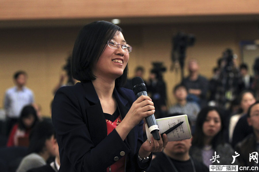 2014年3月5日下午,十二屆全國人大二次會議在梅地亞中心舉行記者會,國家發(fā)展和改革委員會主任徐紹史就“經(jīng)濟(jì)社會發(fā)展與宏觀調(diào)控”的相關(guān)問題回答中外記者的提問。圖為中央人民廣播電臺、央廣網(wǎng)記提問(央廣網(wǎng)記者 張曈 攝)