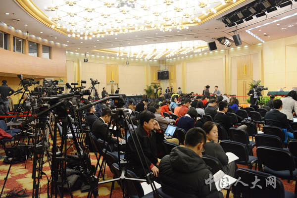 3月8日下午,十二屆全國人大二次會議在梅地亞中心舉行記者會,環(huán)境保護(hù)部副部長吳曉青、污染防治司司長趙英民、環(huán)境監(jiān)測司司長羅毅、污染物排放總量控制司司長劉炳江就“加強(qiáng)環(huán)境保護(hù)建設(shè)美麗中國”的相關(guān)問題回答中外記者的提問。圖為記者會即將開始。馬冬瀟 攝