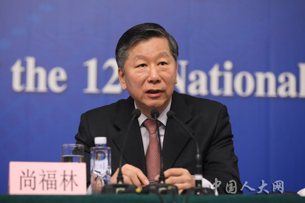 3月11日上午,十二屆全國人大二次會議在梅地亞中心舉行記者會,中國人民銀行行長周小川等五位嘉賓就“金融改革與發(fā)展”的相關(guān)問題回答中外記者的提問。圖為中國銀行業(yè)監(jiān)督管理委員會主席尚福林回答記者提問。羅榮 攝