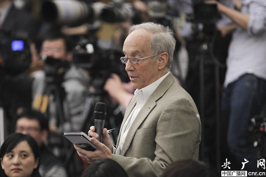 華爾街日?qǐng)?bào)記者提問(央廣網(wǎng)記者 張曈 攝)