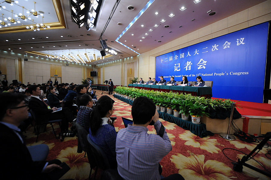 3月9日15時(shí),十二屆全國人大二次會(huì)議新聞中心在梅地亞中心多功能廳舉行記者會(huì),全國人大五位負(fù)責(zé)人將就“人大立法和監(jiān)督工作”相關(guān)問題回答中外記者提問。圖為記者會(huì)現(xiàn)場(chǎng)。陳競(jìng)超 攝