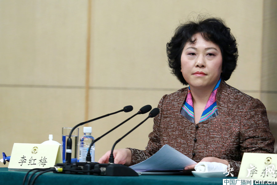 全國(guó)政協(xié)十二屆二次會(huì)議于2014年3月7日(星期五)上午10:30在梅地亞兩會(huì)新聞中心二層多功能廳舉行記者會(huì),邀請(qǐng)全國(guó)政協(xié)委員卞晉平、劉佳義、賴明、李東東(女)等就“推進(jìn)人民政協(xié)協(xié)商民主建設(shè)”的相關(guān)問(wèn)題回答記者提問(wèn)。圖為全國(guó)政協(xié)委員李紅梅出席記者會(huì)(央廣網(wǎng)記者涂傲攝)