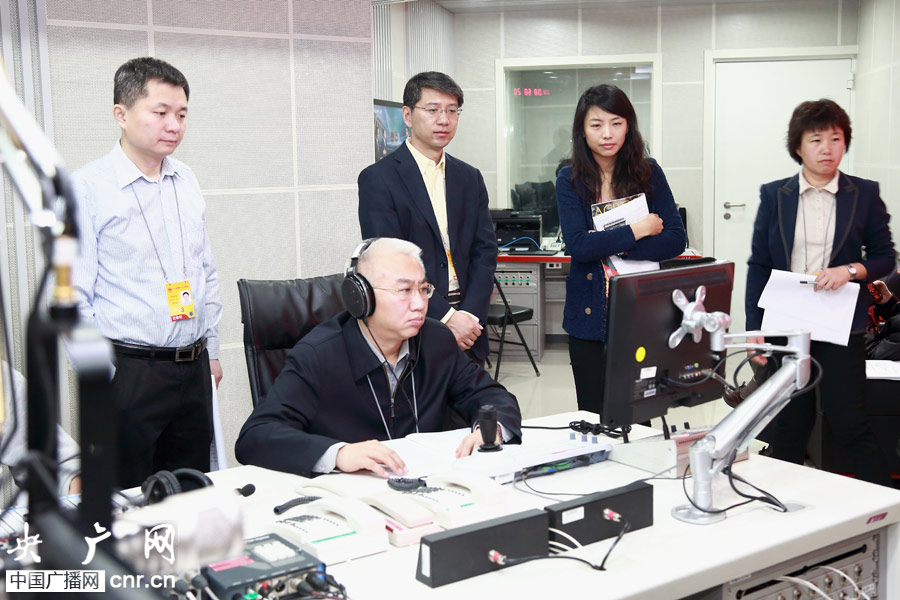 中央人民廣播電臺(tái)副總編輯劉曉龍現(xiàn)場(chǎng)指揮十二屆全國(guó)人大二次會(huì)議第二次全體會(huì)議直播工作