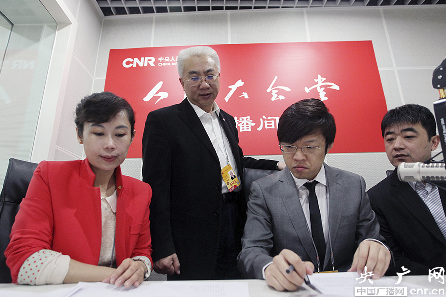 3月13日,十二屆全國(guó)人大二次會(huì)議閉幕,張德江委員長(zhǎng)發(fā)表講話,中央人民廣播電臺(tái)中國(guó)之聲、華夏之聲并機(jī)現(xiàn)場(chǎng)直播,前方直播總指揮劉曉龍副總編指導(dǎo)播音員準(zhǔn)備稿件。