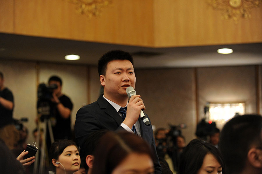 3月4日,十二屆全國人大二次會議新聞發(fā)布會在人民大會堂一層新聞發(fā)布廳召開,大會新聞發(fā)言人向中外媒體介紹本次大會有關情況,并回答記者提問。圖為中新社記者提問。新華網(wǎng)/中國政府網(wǎng) 陳競超 攝