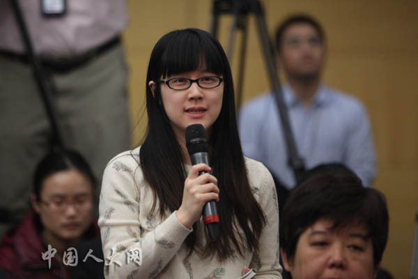 3月7日上午,十二屆全國人大二次會議在梅地亞中心舉行記者會,商務(wù)部部長高虎城就“商務(wù)發(fā)展與對外開放”的相關(guān)問題回答中外記者的提問。圖為中國國際廣播電臺、國際在線記者提問。羅榮攝