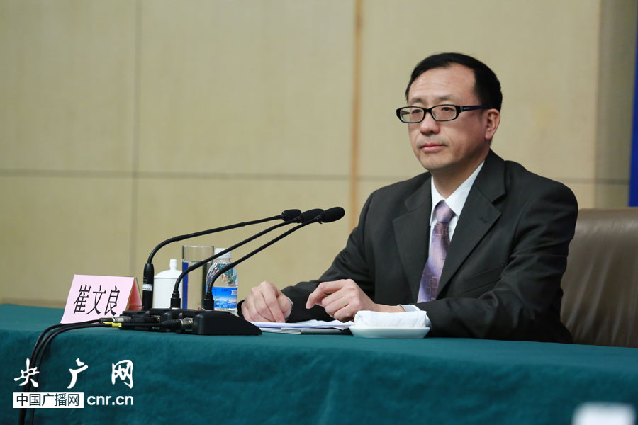 十二屆全國人大二次會議新聞中心副主任崔文良現場主持新聞發(fā)布會(央廣網記者涂傲攝)