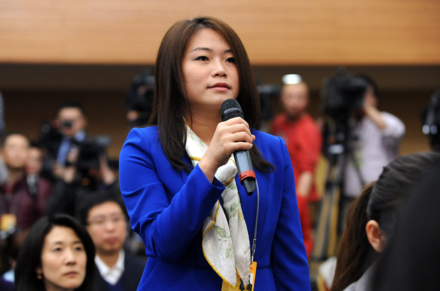 2014年3月8日上午10時,十二屆全國人大二次會議在梅地亞多功能廳舉行記者會,外交部部長王毅就“中國的外交政策和對外關(guān)系”的相關(guān)問題回答中外記者的提問。圖為人民日報和人民網(wǎng)記者提問。新華網(wǎng)/中國政府網(wǎng) 翟子赫 攝