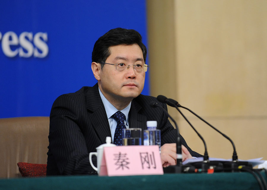 2014年3月8日上午10時(shí),十二屆全國(guó)人大二次會(huì)議在梅地亞多功能廳舉行記者會(huì),外交部部長(zhǎng)王毅就“中國(guó)的外交政策和對(duì)外關(guān)系”的相關(guān)問題回答中外記者的提問。圖為外交部發(fā)言人秦剛。新華網(wǎng)/中國(guó)政府網(wǎng) 翟子赫 攝
