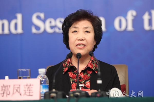 3月10日上午,十二屆全國人大二次會議在梅地亞中心舉行記者會,郭鳳蓮、鐘南山等五位全國人大代表就“人大代表依法履職”的相關問題回答中外記者的提問。圖為全國人大常委會委員,山西省昔陽縣大寨村黨總支書記郭鳳蓮。羅榮 攝