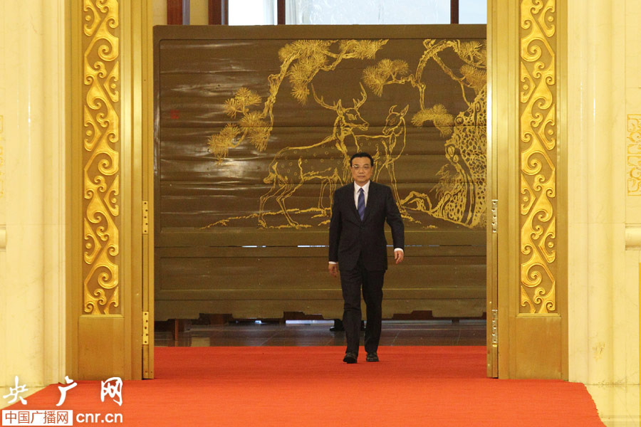 3月13日,國務(wù)院總理李克強(qiáng)在北京人民大會堂與中外記者見面,并回答記者提問。圖為李克強(qiáng)步入會場。 央廣網(wǎng)記者涂傲攝