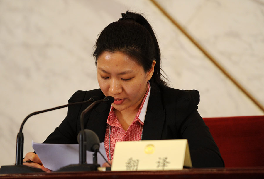 3月2日,全國(guó)政協(xié)十二屆二次會(huì)議新聞發(fā)布會(huì)在人民大會(huì)堂一層新聞發(fā)布廳舉行。圖為發(fā)布會(huì)翻譯。新華網(wǎng)/中國(guó)政府網(wǎng) 翟子赫 攝