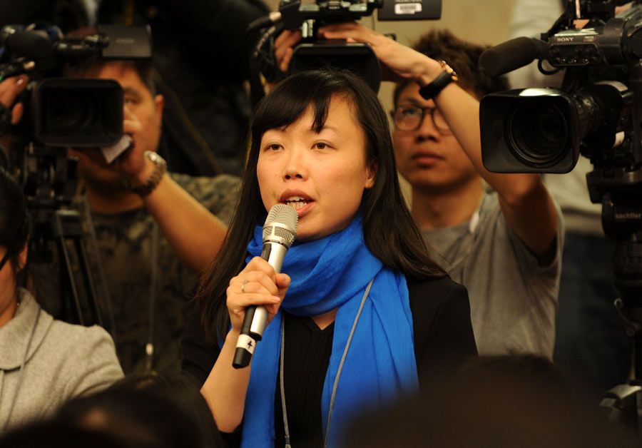 3月2日,全國政協(xié)十二屆二次會議新聞發(fā)布會在人民大會堂一層新聞發(fā)布廳舉行。圖為光明日報記者提問。新華網(wǎng)/中國政府網(wǎng) 翟子赫 攝