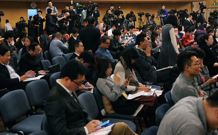 記者會現(xiàn)場,3月11日,十二屆全國人大四次會議新聞中心舉行記者會,邀請環(huán)境保護部部長陳吉寧就“加強生態(tài)環(huán)境保護”的相關(guān)問題回答中外記者的提問。圖為記者會現(xiàn)場。新華網(wǎng)/中國政府網(wǎng) 陳杰 攝