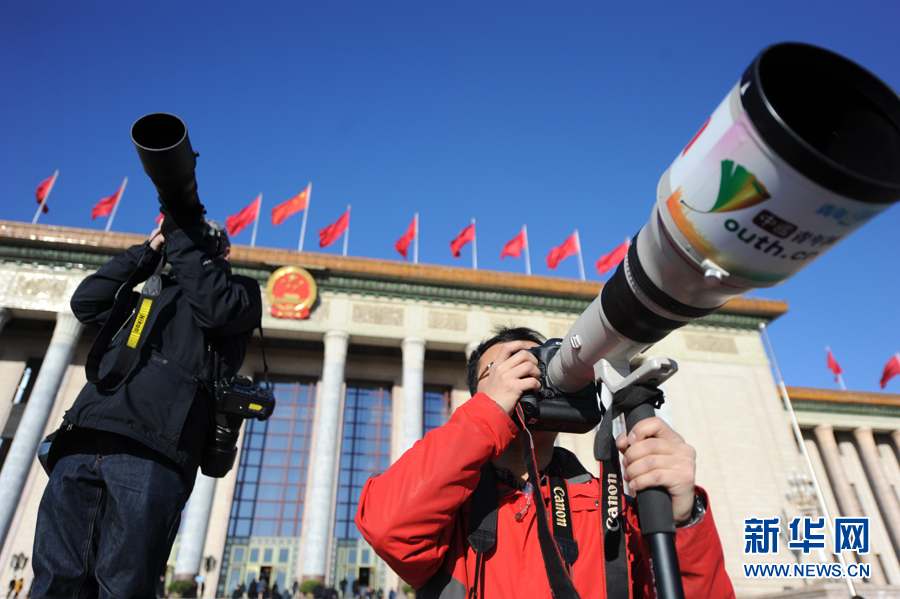3月11日(星期五)9時(shí),全國政協(xié)十二屆四次會(huì)議在人民大會(huì)堂舉行第三次全體會(huì)議,多名政協(xié)委員將就相關(guān)議題作大會(huì)發(fā)言。圖為廣場上正在采訪拍攝的媒體記者。新華網(wǎng)/中國政府網(wǎng)記者 陳競超 攝