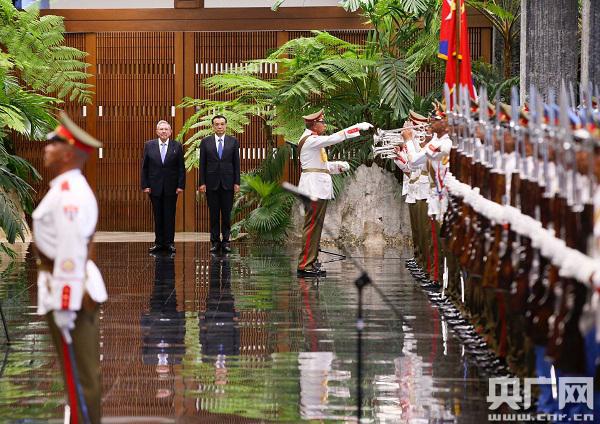 央廣網(wǎng)哈瓦那9月25日消息(記者馬喆)當?shù)貢r間24日下午,古巴國務委員會主席兼部長會議主席勞爾·卡斯特羅在哈瓦那革命宮主持儀式,歡迎中國國務院總理李克強對古進行正式訪問。軍樂團奏響中古兩國國歌,儀仗兵整齊列隊,持槍向兩國領導人致禮。在勞爾·卡斯特羅的陪同下李克強檢閱儀仗隊。