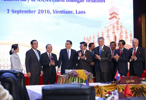國務(wù)院總理李克強當(dāng)?shù)貢r間9月7日上午在萬象國家會議中心同東盟國家領(lǐng)導(dǎo)人共同出席中國—東盟建立對話關(guān)系25周年紀(jì)念儀式。