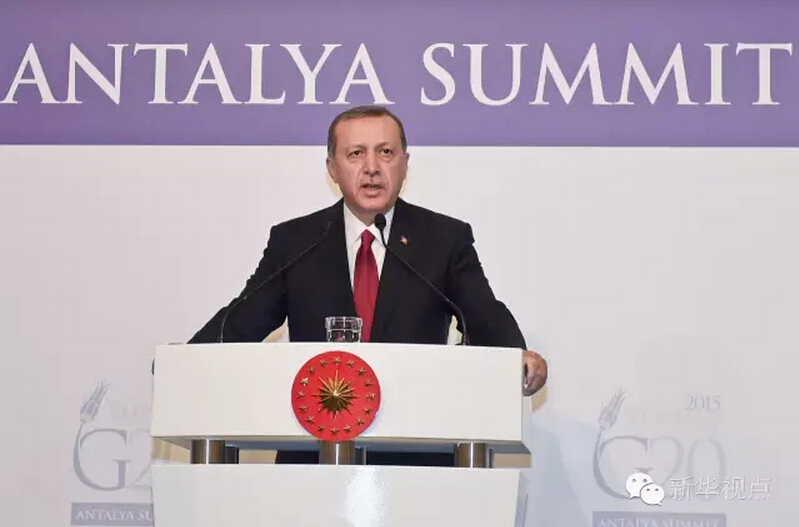 2015年11月,G20峰會(huì)在土耳其安塔利亞舉行,從安塔利亞到杭州,從地中海岸到錢塘江畔,與東道主接力棒一樣順利傳遞的,是對(duì)推動(dòng)全球經(jīng)濟(jì)穩(wěn)步復(fù)蘇、實(shí)現(xiàn)可持續(xù)增長的決心!敖影簟焙蟮闹袊,在議題設(shè)置上既汲取了安塔利亞峰會(huì)的智慧成果,又著眼當(dāng)前、旨在長遠(yuǎn)、彰顯新意。 2015年G20安塔利亞峰會(huì)上的埃爾多安總統(tǒng)↓