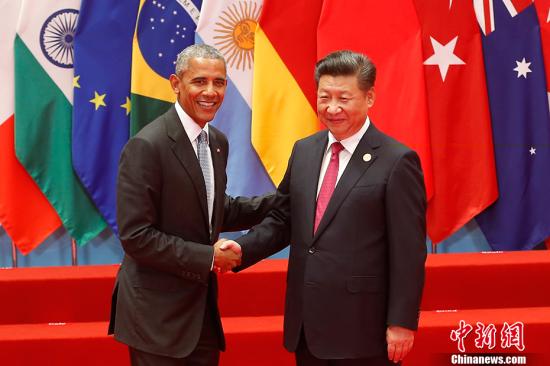 9月4日,二十國(guó)集團(tuán)領(lǐng)導(dǎo)人第十一次峰會(huì)在杭州國(guó)際博覽中心舉行。 圖為習(xí)近平同美國(guó)總統(tǒng)奧巴馬握手。中新社記者盛佳鵬攝