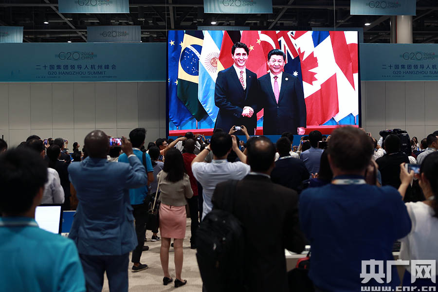 G20杭州峰會(huì)新聞中心媒體記者觀看二十國集團(tuán)領(lǐng)導(dǎo)人步入會(huì)場(央廣網(wǎng)記者 黃一博)