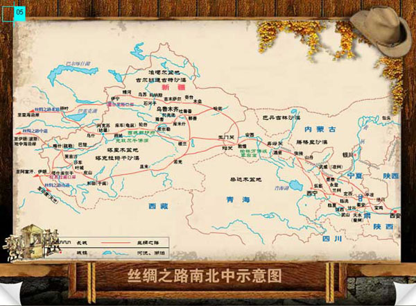絲綢之路,簡稱絲路。是指西漢(前202年—8年)時,由張騫出使西域開辟的以長安(今西安)為起點,經(jīng)甘肅、新疆,到中亞、西亞,并聯(lián)結(jié)地中海各國的陸上通道(這條道路也被稱為“西北絲綢之路”以區(qū)別日后另外兩條冠以“絲綢之路”名稱的交通路線)。因為由這條路西運的貨物中以絲綢制品的影響最大,故得此名(而且有很多絲綢都是我們中國運的)。其基本走向定于兩漢時期,包括南道、中道、北道三條路線。